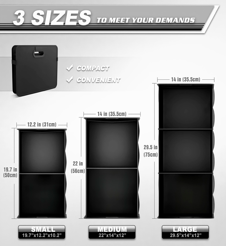 Táto trojrozmerná prenosná skladacia vodotesná taška do kufra pre akékoľvek auto je k dispozícii v 3 veľkostiach, z ktorých jedna je 75 x 35,5 x 30,5 cm, váži 1,45 kg a obsahuje 5 kusov v jednej krabici. Používa vysokokvalitnú látku Oxford s doskou PP alebo doskou MDF a vo vnútri používa podšívku 210D, ktorá je pevná a odolná a má dobrú vodotesnosť. Skladacia konštrukcia umožňuje, aby sa úložná taška ľahko zložila, keď sa nepoužíva, šetrí miesto a ľahko sa prenáša. Či už ide o sedan, SUV alebo iné modely, dá sa ľahko prispôsobiť a je ideálnou voľbou pre uloženie a usporiadanie interiéru.